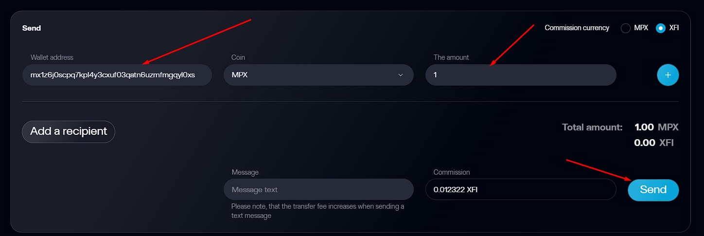 mx1zlxdl376qfele4hgncdyd6y7a8du9wqqak47k3XFImx14ys8msj28zl20ng3k0yqq04phfrc9hyssyazenXFI Send MPX to different two addressesmx1zlxdl376qfele4hgncdyd6y7a8du9wqqak47k3MPXmx14ys8msj28zl20ng3k0yqq04phfrc9hyssyazenMPXSend XFI and MPX to different two addresses in one transaction