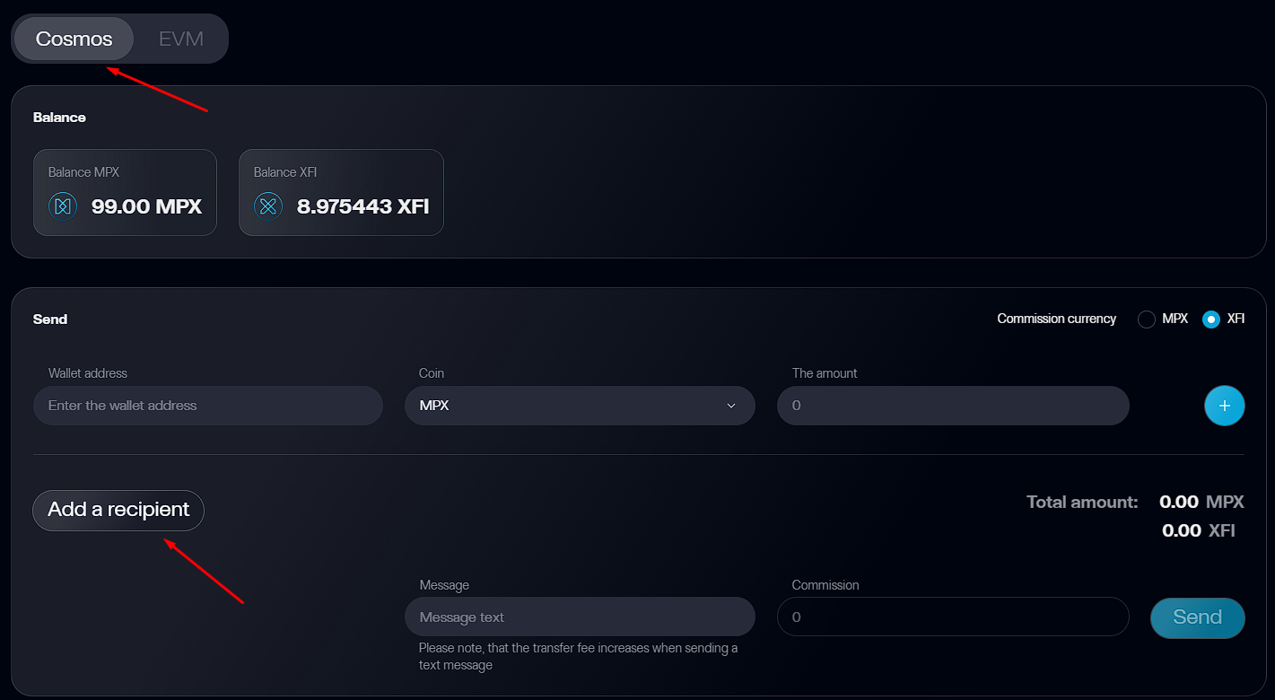 mx1zlxdl376qfele4hgncdyd6y7a8du9wqqak47k3Send XFI to the Cosmos part of the console to another Cosmos wallet addressmx1zlxdl376qfele4hgncdyd6y7a8du9wqqak47k3Send XFI to the EVM part of the console to another EVM wallet address